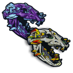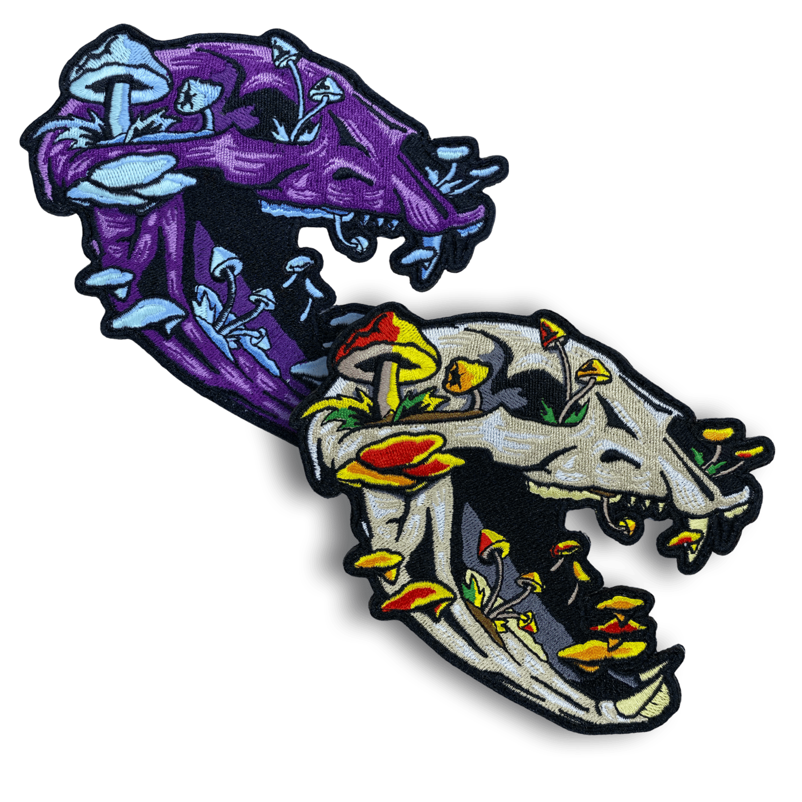 ~4.5 x 5" 100% embroidered black bear skull patch set (one of each colorway) featuring glow in the dark threads (on purple variant only)